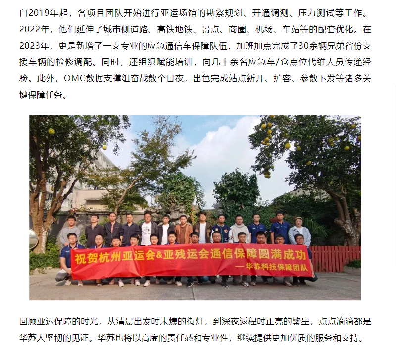 10月,杭州第19屆亞運(yùn)會(huì)和第4屆亞殘運(yùn)會(huì)圓滿落幕,華蘇科技 杭州分公司勇?lián)姑厝危?/span>